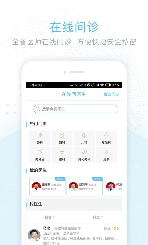 健康山西app通过与各级医疗机构、各级区域卫生信息平台系统对接,为百姓构建省内寻医问诊一站式服务平台,是三晋百姓就医首选。主要提供智慧城市、预约挂号、移动支付、家庭医生、检验报告、健康档案、名医名科、住院服务、咨询医生等服务。