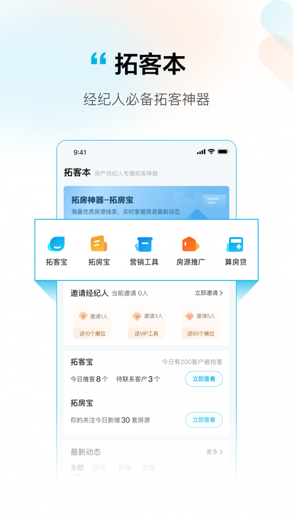 拓客本安卓版,精准客户拓展,有效提升营销效果,让您事业更上一层楼!从事房产经纪人的小伙伴们快来下载这款拓客本安卓版,这是一款专为房产经纪人打造的高品质拓客展业工具,获取更多房源信息,智能分析精准获客,实时跟踪客户订单,致力于用大数据和智能AI技术助力经纪人全面提升获客效率,有需要就来下载。