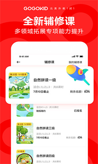 全球领先的在线少儿英语教育,让孩子们轻松快乐提升英语水平。GOGOKID英语完整版是一款专业学习英语的app。,软件采用效率最高的一对一教学,而教师都是采用北美的专业外教,可想而知,效率是多么高,无论词汇量还是口语都能飞速提升。最重要的是能让孩子产生兴趣,每日相处下来英语就要成为“第二母语”了。
