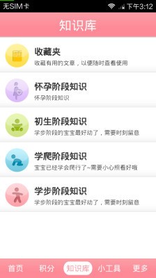 知识库:有怀孕、初生、学爬、学步等各阶段的海量知识可以查看,不同成长阶段提供不同的百科小知识,帮助妈妈们更好的呵护宝宝。