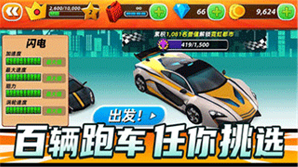 2、玩家将会在这个广阔的地图场景中进行不断的冲刺挑战,自由的改装赛车,从而能够提升赛车的性能。