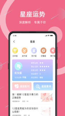 4、【星座运势】十二星座运势一键查询,星座运势每日查询,爱情运势、工作运势、财富运势一一为你呈现,无论你是想查看今天的运势、还是明天、本周、本月、今年的运势,都可为您提供。