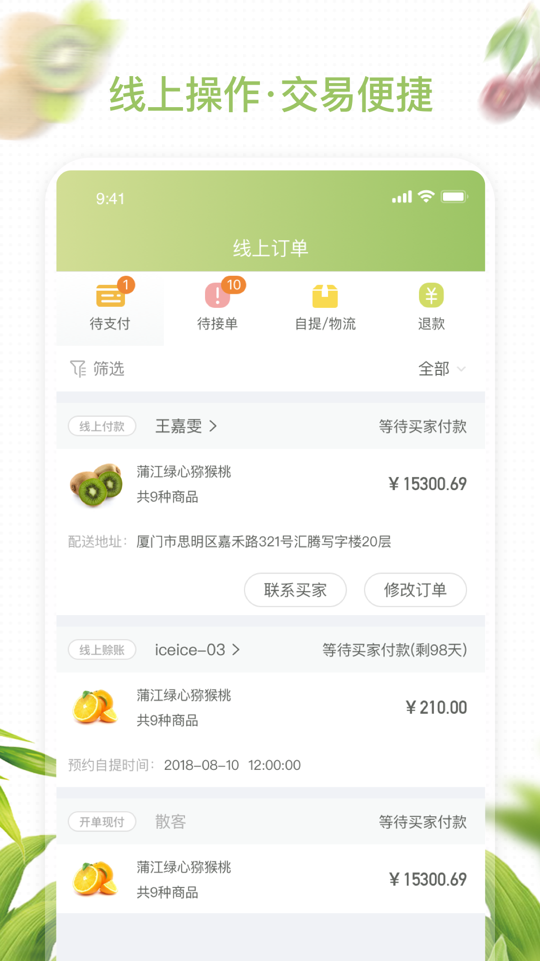 农联在线商家版app专注服务于水果蔬菜行业的商家,为商家用户提供了供应链的效率,如果你是一名个体商户,你可以通过这个应用轻轻松松的开一个网络店铺,能够帮助你实现白手起家开一个网店,不需要任何的经营成本,没有实体店铺开房租的开销,让你的经营成本更低,你甚至可以不用囤货,县发布自己的商品到平台上进行预售;当有客户查看到商品需要购买的时候在进货,能够让你赚钱成本和风险都降到最低,让你慢慢的把自己的店铺经营壮大,是商家必备的店铺经营软件,快来下载农联在线商家版app使用吧!