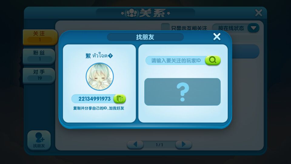 1、在关系系统中我们可以很快速的找到我们的蛇精伙伴,只需要点击关系界面左下角“找朋友”输入对方的ID编号就可以搜索到了,也可以把自己的ID编号复制下来发给你的好友,让对方加你亦可。