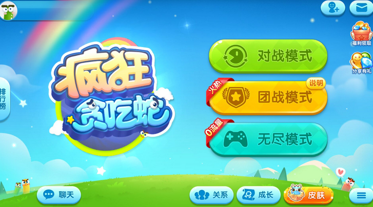 首先,你们能看见本蛇王的“门牌”,就是《疯狂贪吃蛇》啦。然后本蛇王的房间有很多很多,每点开一个按钮,就是打开一扇房间的大王。本蛇王主要有三大房间,房名分别为“对战模式”、“团战模式”和“无尽模式”,还有一些小房间,就是“排行榜”、“福利中心”“聊天”等等。房间的分布很合理,知道你们都想入住了。