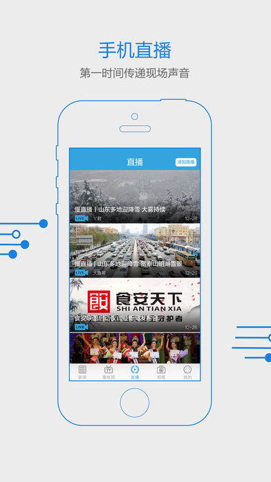 网友可根据个人喜好订阅观看山东广播电视台所有节目,也可以通过随手拍、摇电视、报名、投票等互动功能,随时发起互动直播报道,变山东广播电视台观众为参与内容生产的用户,形成新闻资讯、生活服务、互动活动等为一体的融媒体平台;