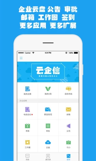 中国移动云企信,企业通讯与信息化的一站式解决方案。无论您身处何地,都能通过云企信实现高效沟通与办公。企业通讯录、即时消息、多媒体会议、移动办公等功能一应俱全,满足企业多样化需求。出色的使用体验和强大的独家功能让您体验到最优秀的企业交流乐趣!感兴趣的用户赶快来下载吧!中国移动云企信iOS版给您精彩无穷,感兴趣的用户赶快来下载吧!