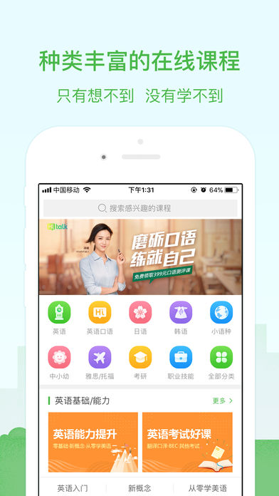 丰富的课程体系、学习性社交校园、权威的外语教学、先进的独创课件、专业的课程答疑,让您体验前所未有的在线教育魅力!我们一直在不断突破,力求打破传统,颠覆你的学习想象,创造全新学习体验!