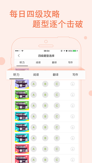 1、全面性:包括2006年-2016年所有四级听力真题,单词、听力、阅读、翻译和写作微课全有,并持续更新;