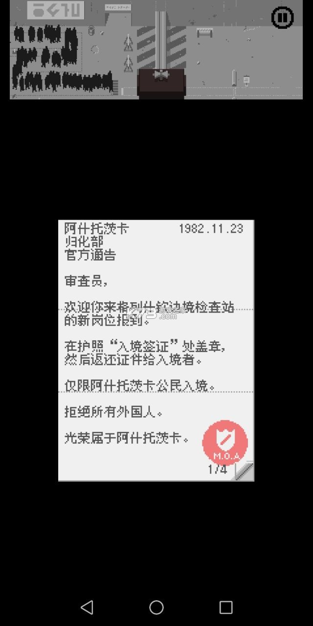 如同经历了许多经历般,多样化却又满满的危险,请出示证件ios内测版是一款复古像素风格的模拟解谜类游戏。游戏背景设定在80年代的阿什托茨卡边境,你将扮演一位边境检察官,需要检查每个入境人员的相关文件,配合上层的工作。不过朝令夕改的政策、五花八门的人员,让你的工作日益艰难。游戏拥有丰富的剧情故事,还有令人出乎意料的结局。