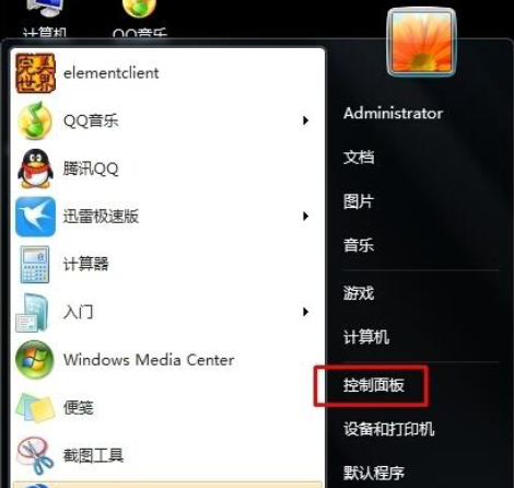 2、点击“开始”按钮(也可以按键盘上的Windows徽标键)弹出开始菜单。鼠标单击控制面板。看到控制面板页面。