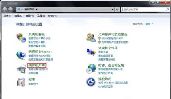3、在弹出的“控制面板”页面里单击“硬件和声音”(绿色字的)。以弹出硬件和声音控制页面。