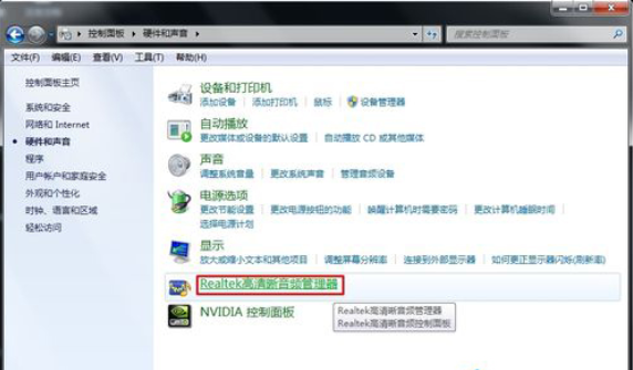 4、在弹出的硬件和声音控制页面中单击“Realtek高清晰音频管理器”(第6项,绿色字的)。以弹出Realtek高清晰音频管理器页面。