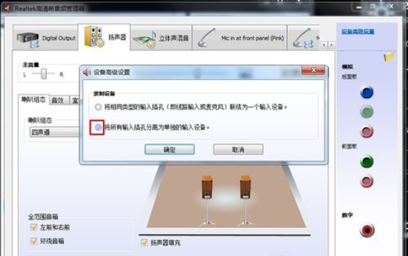 6、在高级设置页面里把“将所有输入插孔分离为单独的输入设备”前面那个单选框选中。然后按所有窗口的弹出顺序倒序按“确定”。